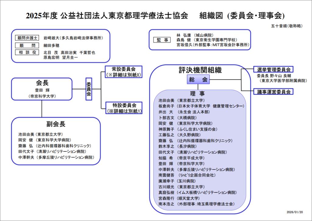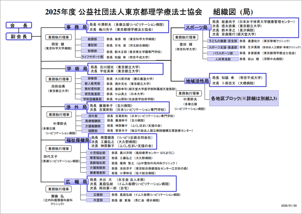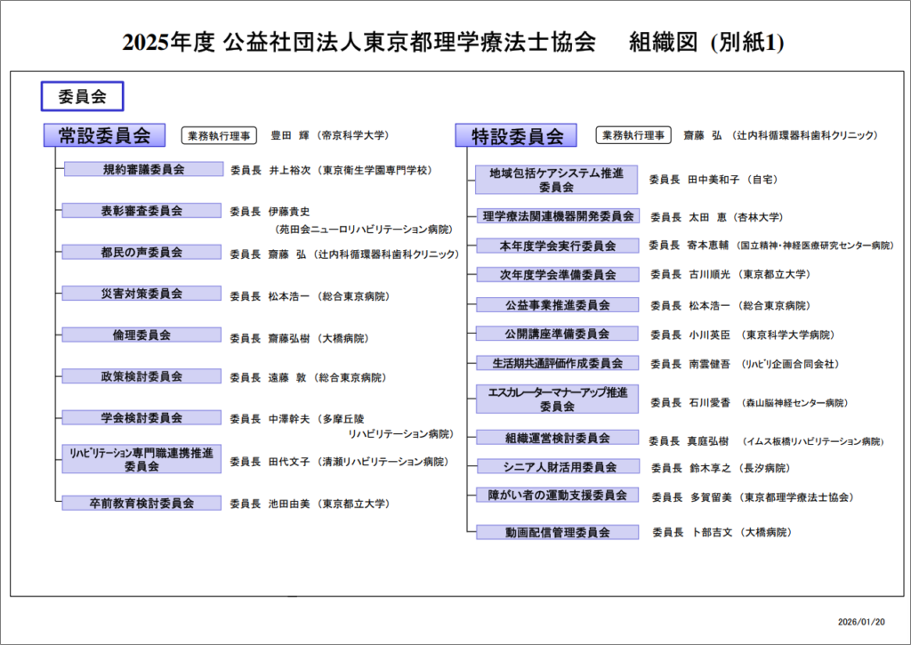 本協会についてAbout 本会について 会長ご挨拶 事業内容 定款・組織図 後援・共催申請について 定款・組織図 定款 公益社団法人 東京都理学療法士協会 定款 2025.10(PDF) 公益社団法人 東京都理学療法士協会 倫理規定(PDF) 本会組織図 2025年度 東京都理学療法士協会の組織図(PDF) 【2026.1.27】